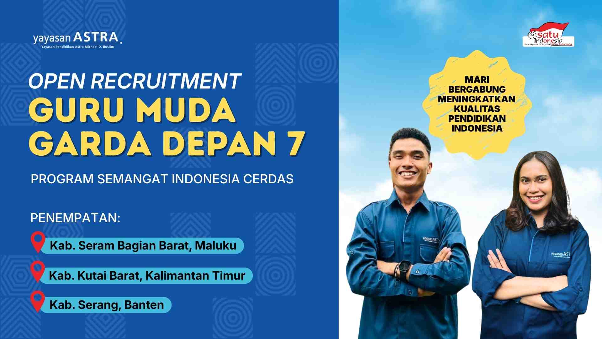 Selama Juni 2026 hingga Juni 2027, peserta terpilih akan bertugas mendampingi Kepala Sekolah, Guru, dan Tenaga Kependidikan di sekolah binaan di Kab. Seram Bagian Barat, Kab. Kutai Barat, atau Kab. Serang.